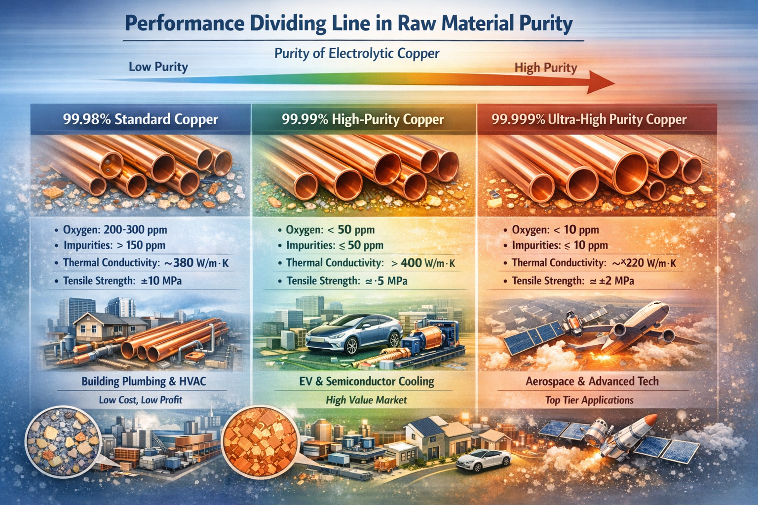Majoritatea producătorilor mici și mijlocii de tuburi de cupru, constrânși de capital limitat și cereri de profit pe termen scurt, adoptă un „ cost-în primul rând „strategia de achiziții, prioritizarea materiilor prime cu preț scăzut, de puritate standard. Pentru a reduce și mai mult costurile, unii chiar achiziționează materii prime substandard care sunt alterate sau care conțin impurități excesive. Aceste companii nu au o viziune strategică pe termen lung, neglijând impactul purității materiilor prime asupra performanței produsului, ratelor de defecte și reputației mărcii. Deși acest lucru poate reduce costurile de achiziție pe termen scurt, duce la performanțe substandard ale produsului, rate mari de defecte, oportunități ratate pentru comenzi de ultimă generație și costuri crescute ale serviciului post-vânzare, prinzându-le într-un cerc vicios de „preț scăzut, calitate scăzută”.