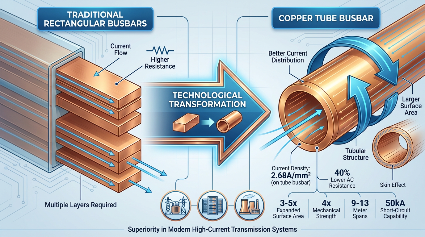 Modernizarea infrastructurii energetice globale generează o cerere fără precedent pentru tub de cupru bare colectoare. Deși reprezintă doar 2%-3% din cererea totală de tuburi de cupru, aceste produse se confruntă cu rate de creștere care depășesc 200% anual în aplicații precum substații de ultra-înaltă tensiune, centre de date și centrale energetice noi. Avantajul principal constă în ei structură tubulară goală , care extinde suprafața conductorului de 3-5 ori, asigură o distribuție uniformă a curentului de-a lungul peretelui tubului, reduce coeficientul de efect al pielii sub 0,8 și scade rezistența AC cu 40% în comparație cu barele colectoare dreptunghiulare cu secțiune transversală echivalentă.