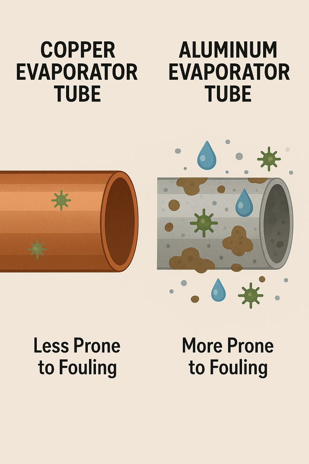 Murdăria este o problemă comună în sistemele de răcire, unde murdăria, umezeala și alți contaminanți se acumulează pe suprafețele schimbătorului de căldură, reducând performanța sistemului. Tuburile de evaporare din cupru sunt mai puțin predispuse la murdărire decât aluminiul, deoarece proprietățile lor de suprafață inhibă acumularea de contaminanți.