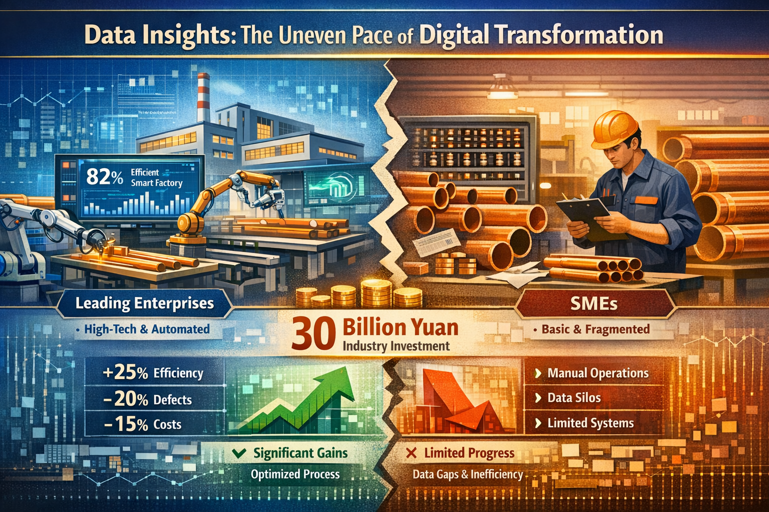 "Am cheltuit peste 8 milioane de yuani pentru un sistem ERP și o platformă de monitorizare a producției, dar, în cele din urmă, am mutat online doar registrele noastre pe hârtie. Eficiența producției nu s-a îmbunătățit prea mult și chiar a crescut volumul de muncă pentru angajații noștri." Domnul Wang, şeful unui mijlociu tub de cupru companie din provincia Henan, a exprimat dilema comună cu care se confruntă industria în transformarea sa digitală. Condusă de inițiativa „Made in China 2025” și de valul Industry 4.0, industria tuburilor de cupru a înregistrat o creștere a eforturilor de transformare digitală, companiile de la întreprinderi lider până la producători mici și mijlocii investind masiv în echipamente inteligente și sisteme digitale. Cu toate acestea, realitatea este că majoritatea companiilor sunt prinse într-un ciclu de „investiții grele, profit redus”, digitalizarea rămânând superficială; doar câteva companii au obținut o împuternicire profundă, valorificând digitalizarea pentru a conecta întregul lanț de producție, lanțul de aprovizionare și serviciul pentru clienți, rezultând în reducerea costurilor și îmbunătățirea eficienței. Pe de o parte, există formalismul „digitalizării de dragul digitalizării”, iar pe de altă parte, există transformarea efectivă a „conducerii creării de valoare prin digitalizare”. De ce există o astfel de polarizare în transformarea digitală a industriei tuburilor de cupru? În spatele acestui lucru se află o interacțiune complexă de părtiniri cognitive, adaptare tehnologică, sprijin pentru talent și planificare strategică, care se referă și la forța motrice de bază pentru dezvoltarea de înaltă calitate a industriei.