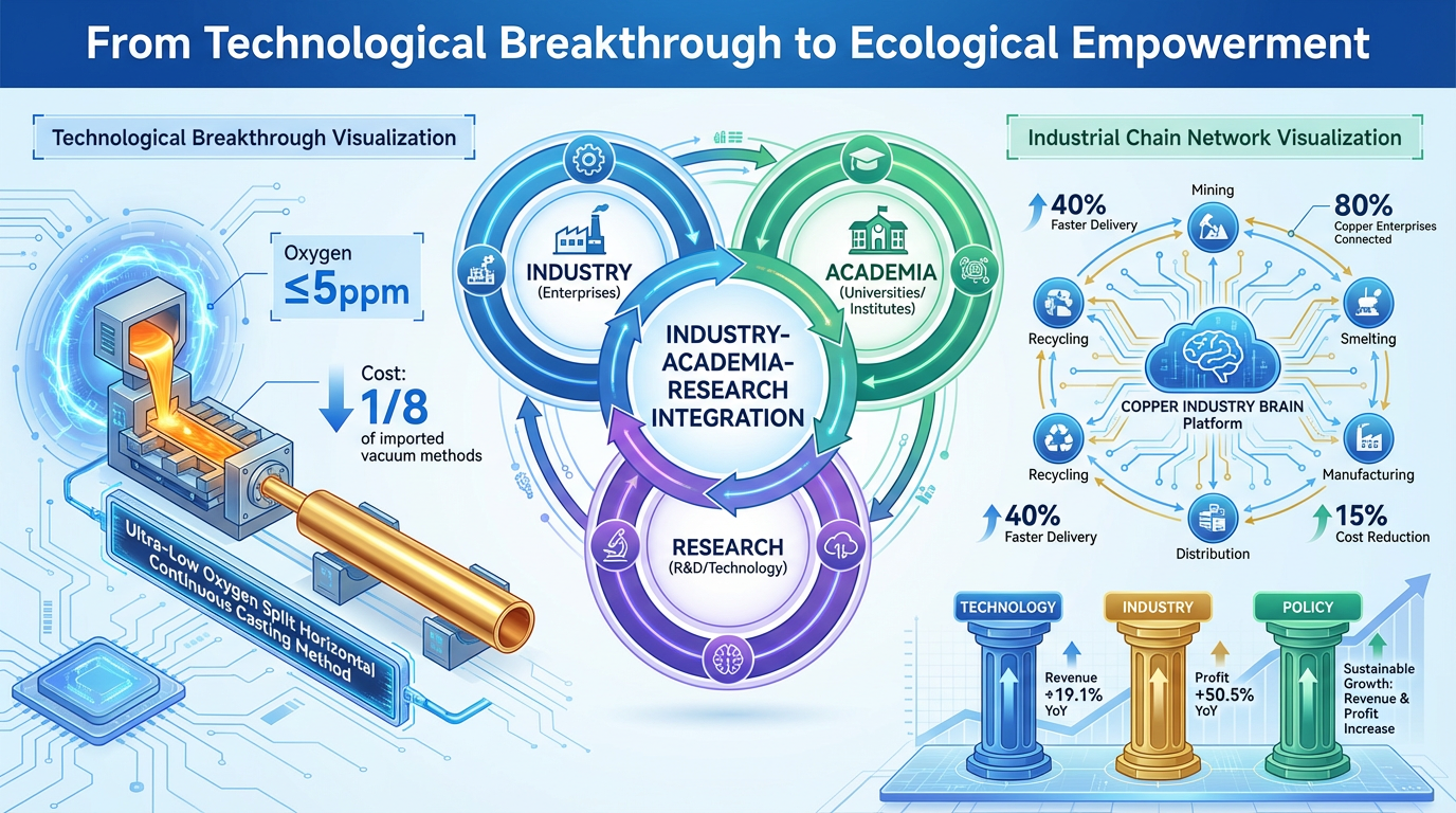 Sfera de colaborare se extinde la întregul lanț. Întreprinderile din cupru din Jiangxi au construit un „Creier al industriei cuprului” care conectează 80% dintre întreprinderile din cupru ale orașului, permițând partajarea capacităților și coordonării comenzilor prin analiza datelor mari. This abordare a platformei permite IMM-urilor să participe la competiții de vârf: atunci când o companie primește o comandă foarte mare, sistemul o împarte automat între mai multe fabrici pentru producție paralelă, reducând timpul de livrare cu 40% și costurile cu 15%. În ceea ce privește politicile, „Planul de implementare a dezvoltării de înaltă calitate a industriei cuprului (2025-2027)” susține în mod explicit consorții de inovare, care urmăresc să depășească 10-12 tehnologii „gât de sticlă” în termen de trei ani. This sinergie tridimensională „tehnologie-industrie-politică” a contribuit la realizarea industriei cupru din Jiangxi la o creștere a veniturilor de la an la an cu 19,1% și o creștere a profitului cu 50,5% în primele trei trimestri ale anului 2025.