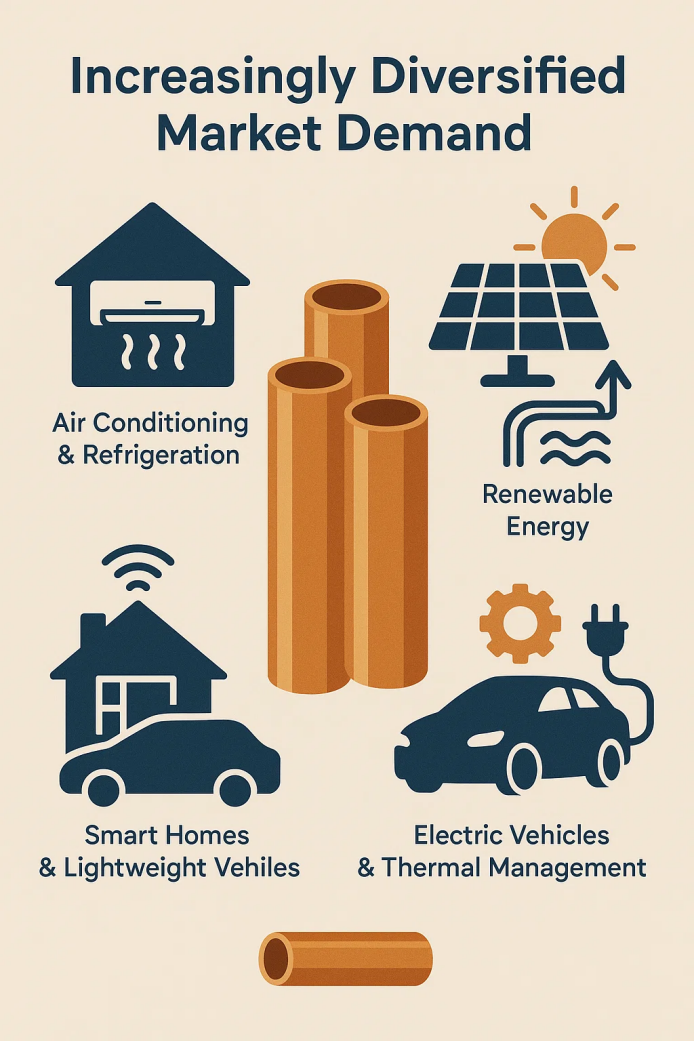 Odată cu dezvoltarea accelerată a caselor inteligente, a vehiculelor ușoare și a electrificării, scenariile de aplicare ale tuburilor de cupru se extind și ele. Tuburile de cupru de înaltă performanță nu sunt doar componente de bază pentru condensatoare și evaporatori în aparatele de acasă, dar joacă și un rol crucial în sistemele de gestionare termică a noilor vehicule energetice. Se preconizează că această piață va continua să crească.