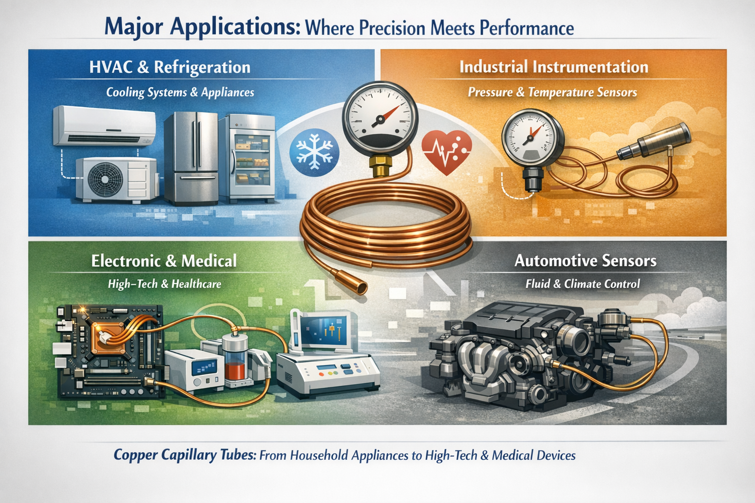 Datorită capacității lor de a controla fluxul de fluid cu o precizie extremă, tuburile capilare de cupru se găsesc în orice, de la aparate de uz casnic până la echipamente medicale de salvare.