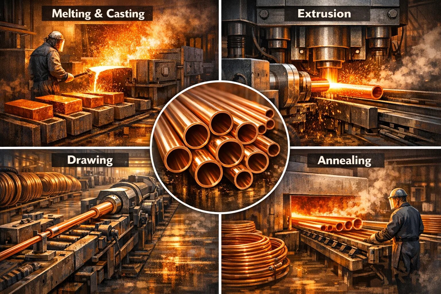 Intrarea într-o fabrică de tuburi de cupru se simte ca și cum ați intra într-o lume a focului și a preciziei. Procesul de transformare a unui bloc greu de metal într-un tub subțire și gol este o ispravă de inginerie. Să o împărțim în patru pași simpli: