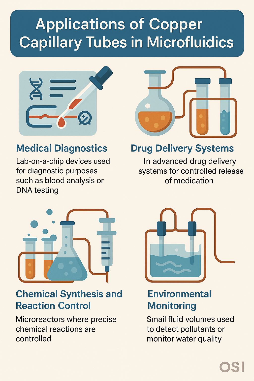 Versatilitatea lui tuburi capilare de cupru le permite să fie utilizate într-o varietate de aplicații microfluidice. Unele dintre cele mai proeminente domenii în care sunt utilizate aceste tuburi includ: