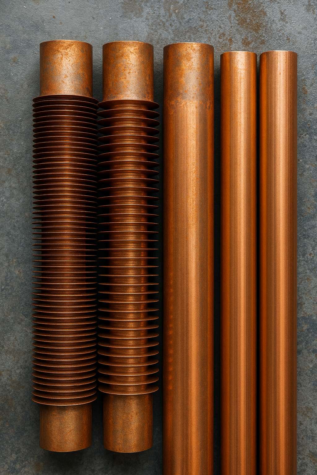 În multe schimbătoare de căldură, aripioare sunt atașate la tuburile de cupru pentru a crește suprafața în contact cu fluidul, sporind astfel eficiența transferului de căldură. Tuburi de cupru cu aripioare combina beneficiile termice ale cuprului cu suprafața adăugată oferită de designul aripioarelor. Aripioarele, de obicei realizate din cupru sau aluminiu, sunt fixate pe suprafața tubului pentru a facilita un transfer mai eficient de căldură, permițând un contact mai mare cu fluidul din jur.