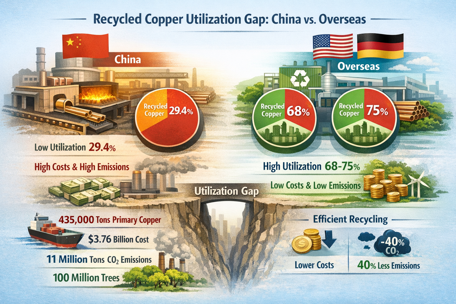În contrast puternic, companiile de peste mări demonstrează capabilități de reciclare foarte eficiente . Mueller Industries, un important producător de tuburi de cupru din SUA, se mândrește cu o rată de utilizare a cuprului reciclat de 68%. Lor clădire si aer condiționare tuburile de cupru sunt fabricate în principal din cupru reciclat, iar prin optimizarea precisă a procesului și controlul compoziției, calitatea produsului nu se poate distinge de produsele fabricate din cupru virgin. Grupul german KME și-a crescut și mai mult rata de utilizare a cuprului reciclat la 75%, valorificând sistemul sofisticat de sortare și reciclare a deșeurilor de cupru din Europa pentru a obține un ciclu în buclă închisă de „ reciclarea deșeurilor de cupru — sortare precisă — topire și rafinare — producție de tuburi de cupru ." Acest lucru are ca rezultat un cost de producție per tonă de tub de cupru care este cu 1800-2200 de yuani mai mic decât cel al companiilor chineze și o intensitate a emisiilor de carbon care este de numai 40% din cea a companiilor chineze.